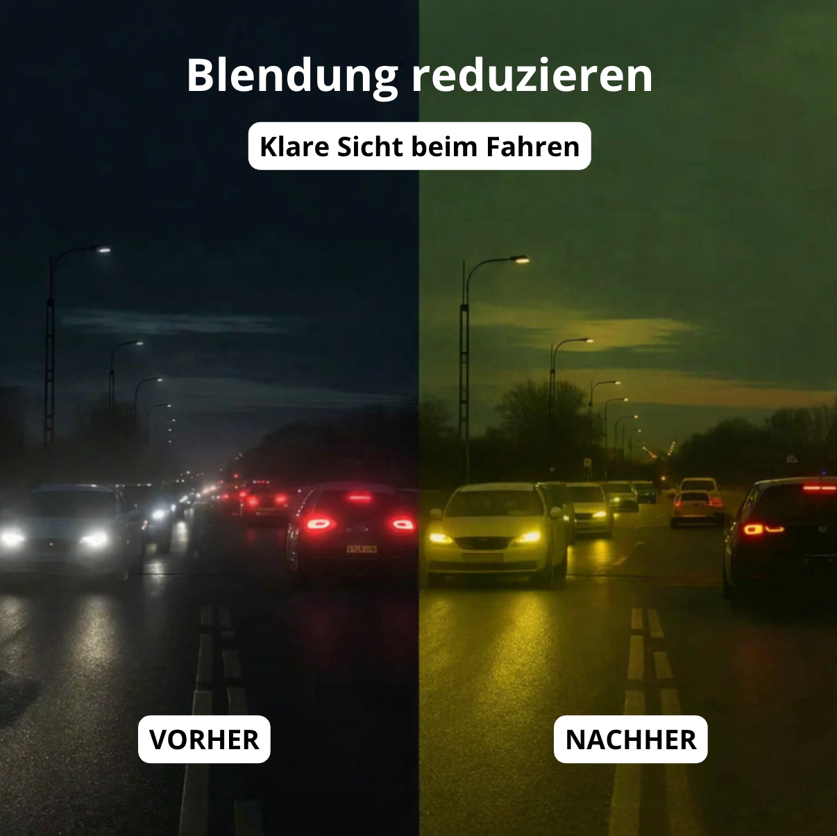 Die speziellen gelb getönten Filter reduzieren aggressive Blendungen durch moderne LED-Scheinwerfer und Straßenlaternen. Das Ergebnis: Eine klare, ruhige Sicht auf die Straße, ohne ständig blinzeln zu müssen.